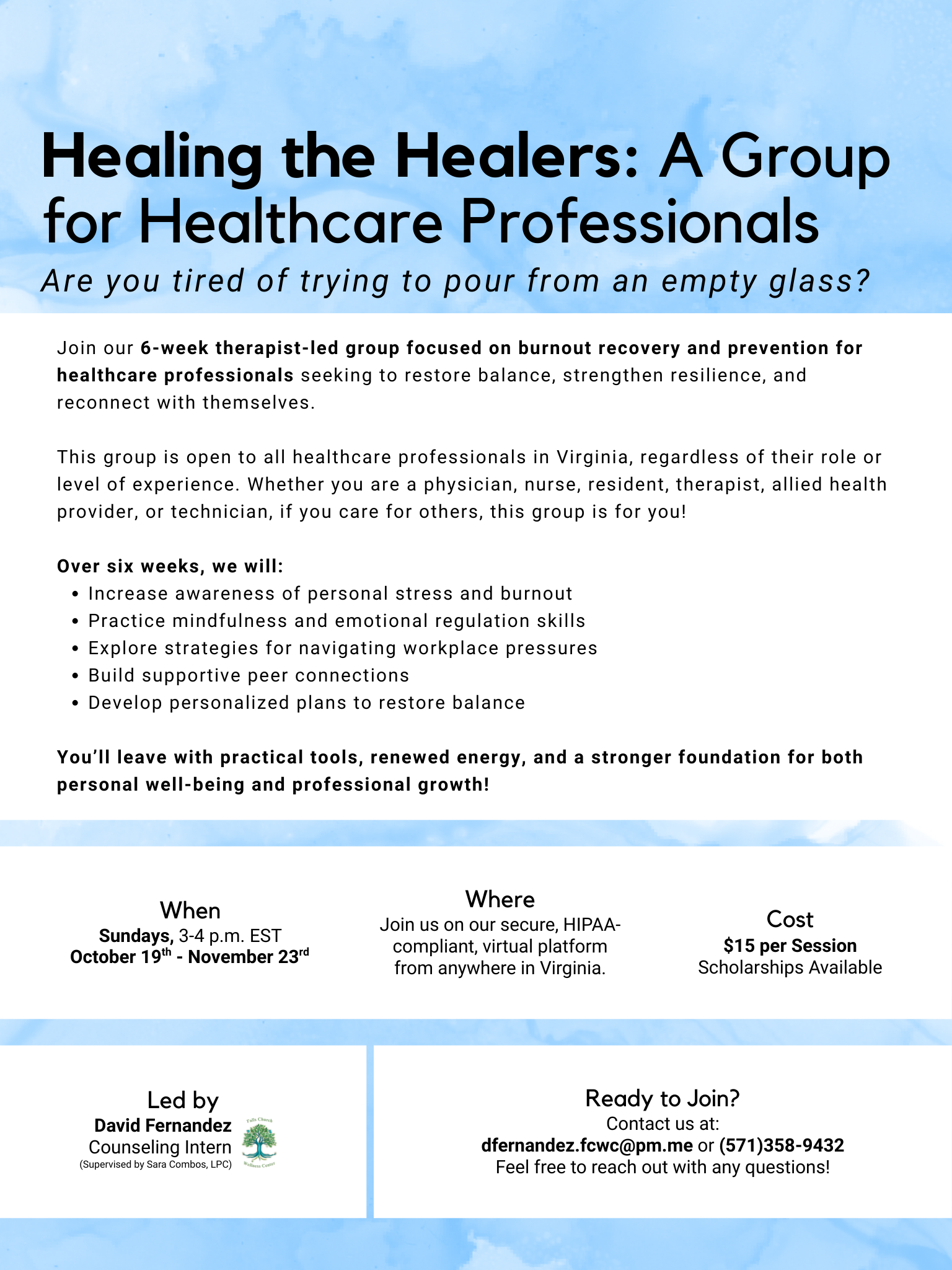 Caring for others is meaningful work, but it can also be draining. This 6-week, therapist-led group aims to help you restore balance, build resilience, and reconnect with yourself and your "Why." This group is open to any helping professionals at any stage of their career, including physicians, nurses, residents, allied health providers, therapists, technicians, and more!